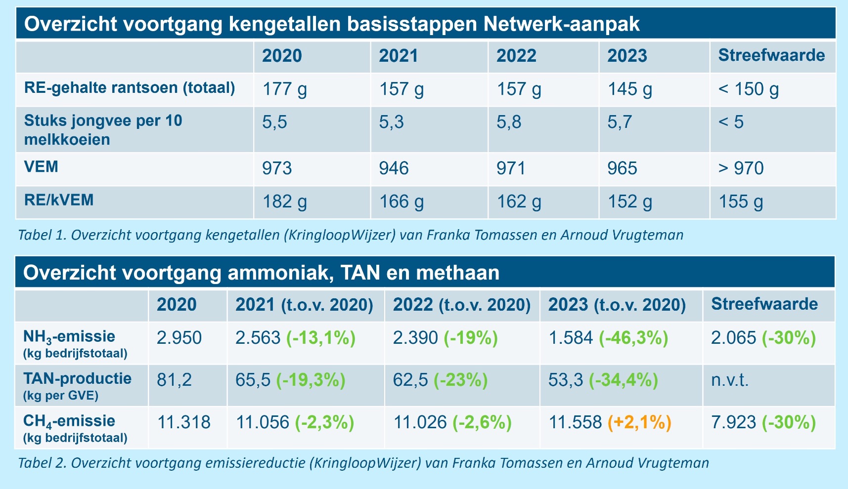 In slechts een paar jaar tijd verlaagden de boeren hun ammoniakemissie met 46,3% (zie tabel 2). Een forse daling, die voor een groot gedeelte te danken is aan de afname van het ruw eiwitgehalte in het rantsoen. “In 2020 zaten we op 177 g/kg DS, nu op zo’n 145 (zie tabel 1)”, blikt Franka terug. “Dat komt mede omdat wij aan het extensiveren zijn en steeds meer balen van natuurgrond aan onze koeien voeren. Deze bevatten een veel lager eiwitgehalte.”