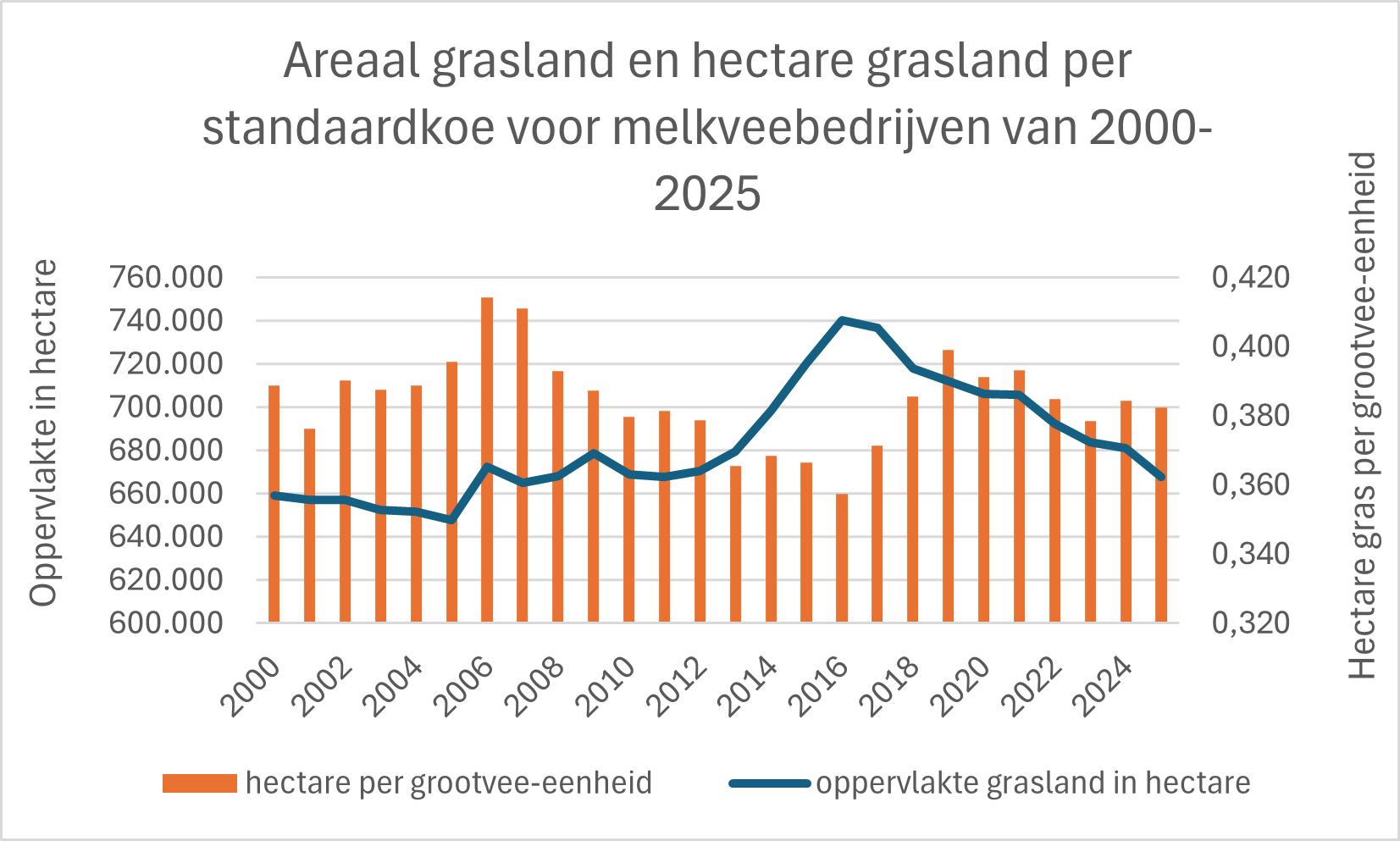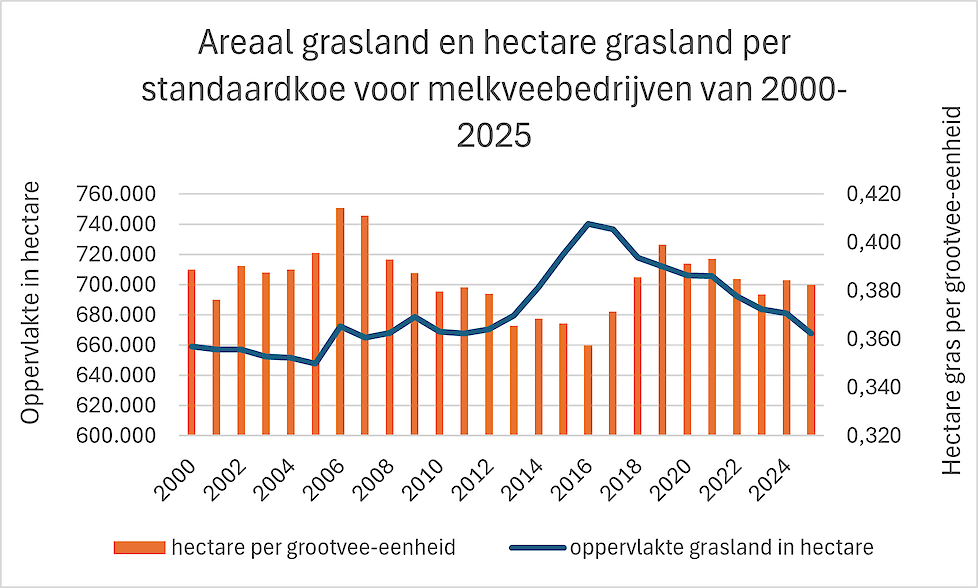 In 2025 is er 0,38 hectare grasland per melkkoe beschikbaar. De afgelopen 25 jaar schommelde de hoeveelheid grasland per melkkoe steeds rond de 0,40 hectare. In 2006 was het 0,41 hectare en in 2016 0,36 hectare.
