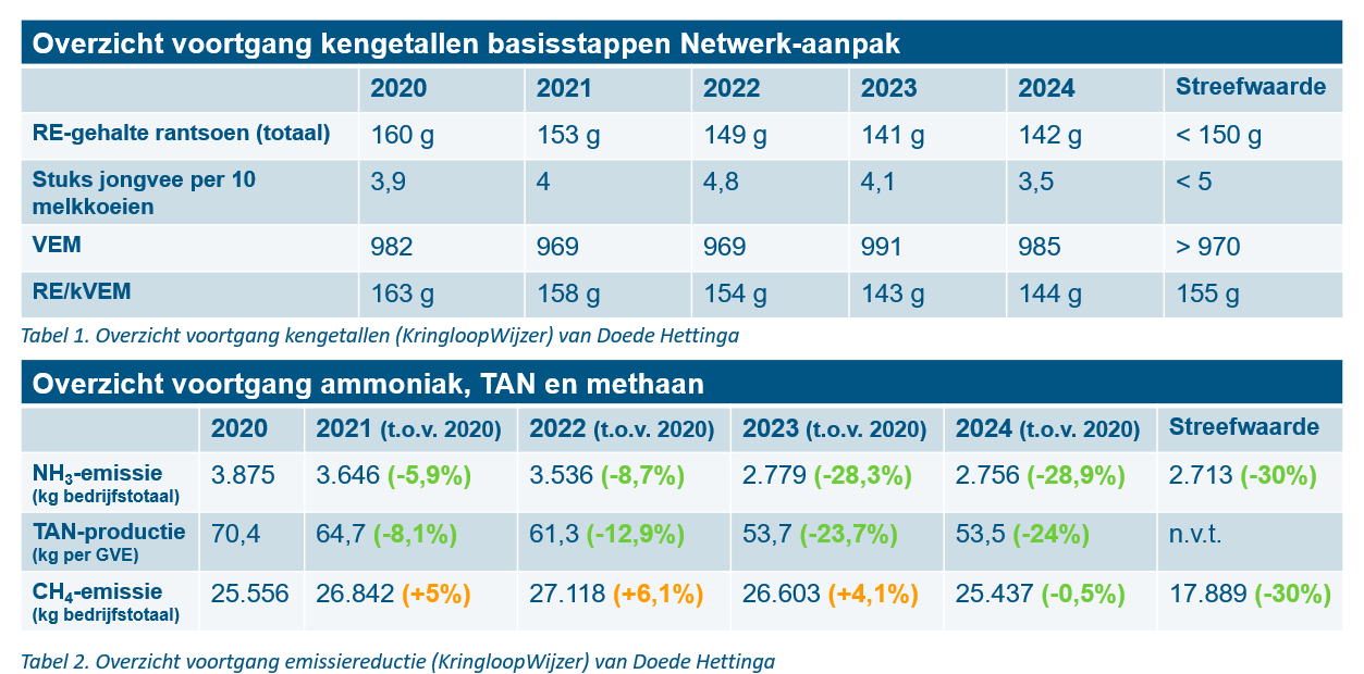 In het eerdere project zette hij al stappen in het reduceren van emissies. Toch behaalde hij in 2024 alsnog 28% reductie (t.o.v. beginjaar 2020). De sleutel ligt volgens hem in ruw eiwit in het rantsoen verlagen. In 2024 zat hij op 142 g/kg DS (t.o.v. 160 g/kg DS in 2020).