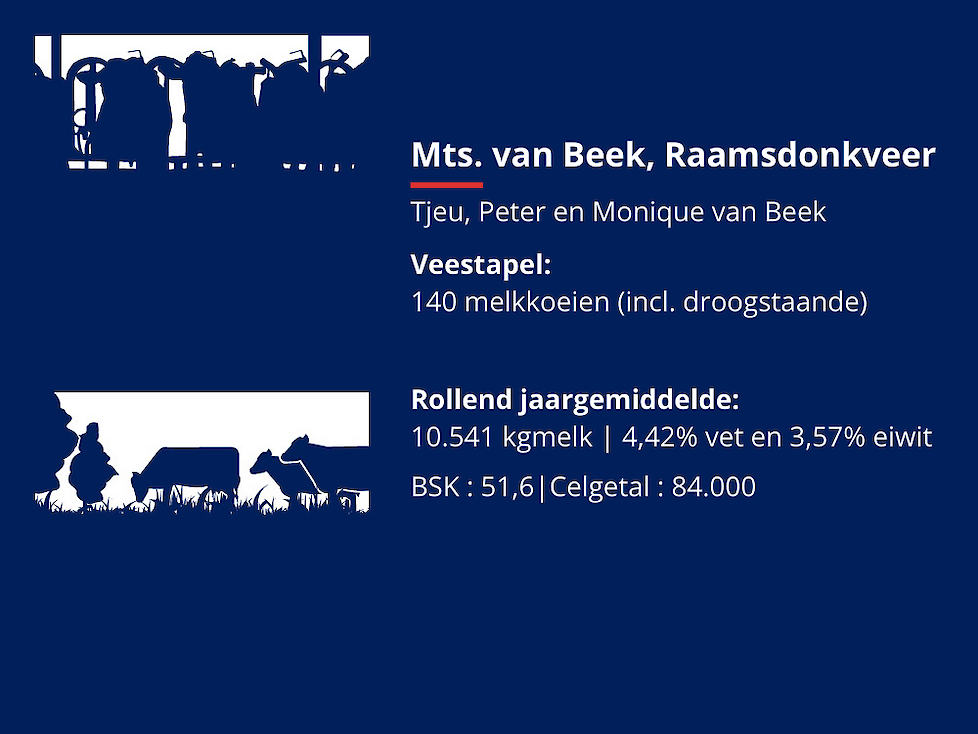 Het was een lang traject, maar de combinatie van gerichte maatregelen en betrouwbare producten heeft ervoor gezorgd dat de familie Van Beek de uiergezondheid en het celgetal weer onder controle kreeg. ‘Tijdens de laatste melkcontrole was het geometrisch celgetal weer terug op 84,’ vertelt Tjeu tevreden. ‘Maar minstens zo belangrijk is dat het arbeidsplezier weer terug is. Van zieke koeien word je niet blij.’