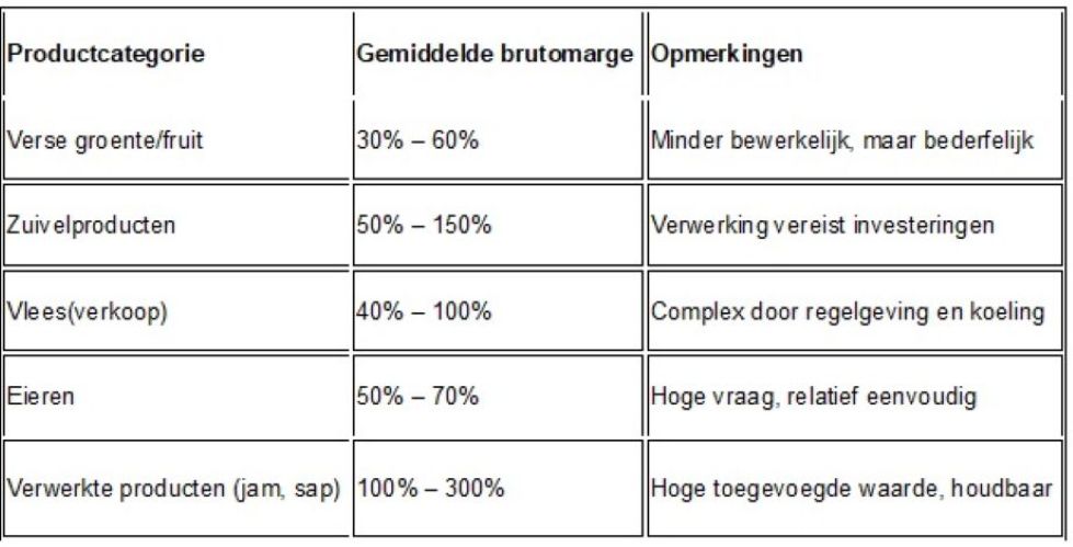De hoogste marges haal je vaak op verwerkte en houdbare producten. Ze zijn schaalbaar, goed te labelen als ‘ambachtelijk’ of ‘huisgemaakt’ en hoef je niet direct te verkopen. De investering per eenheid is wel hoger en er zijn vaak vergunningen of HACCP-eisen aan verbonden.