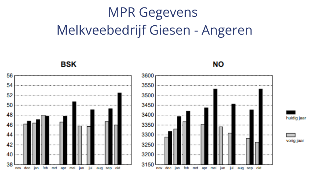 Normaal zakt de productie in de zomer wel wat weg’, vertelt Rob, terwijl op de laatste mooie dagen van november de koeien nog buiten lopen. ‘Tijdens de weidegang merk je dat wisselend weer en verschillen in graskwaliteit invloed hebben op de productie en gehalten. Maar dit jaar niet. De koeien bleven heel stabiel en de gehalten zijn zelfs gestegen’. De stijging in gehalten is overduidelijk.