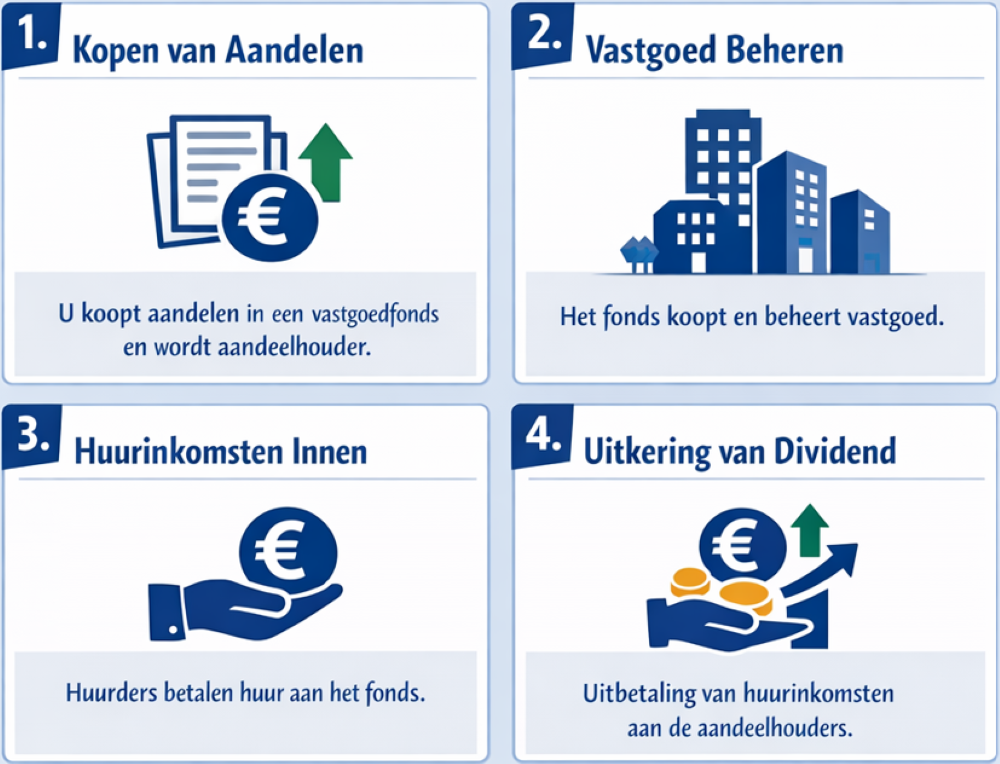 Vanaf dat moment bent u aandeelhouder. - Het vastgoedfonds verwerft gebouwen en beheert de portefeuille, in ruil voor beheervergoedingen.