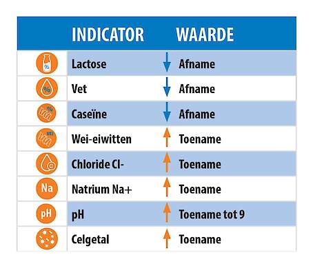 - Geleidbaarheid: De elektrische geleidbaarheid neemt toe door meer zouten en mineralen in de melk die vanuit het uierweefsel in de melk terechtkomen