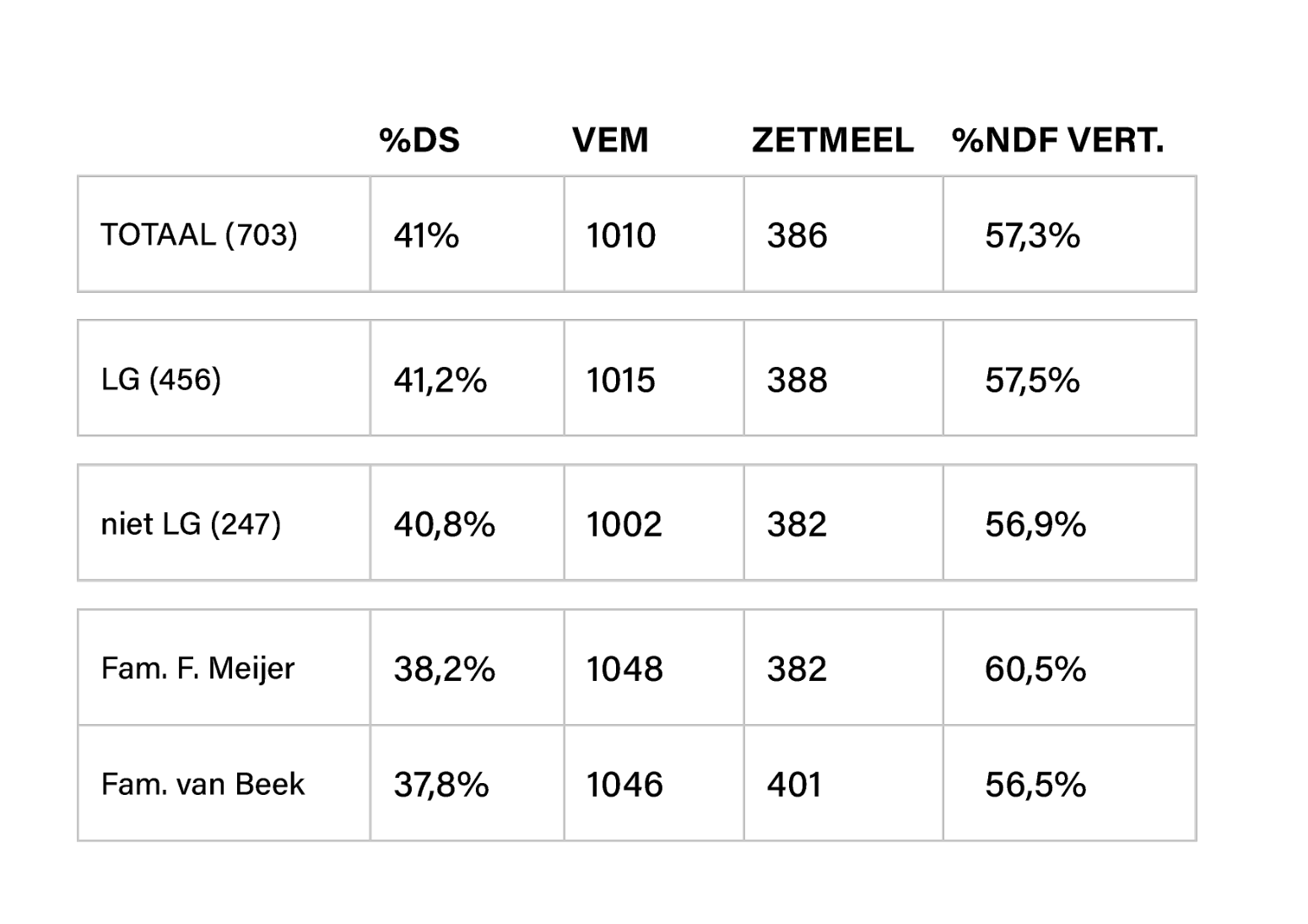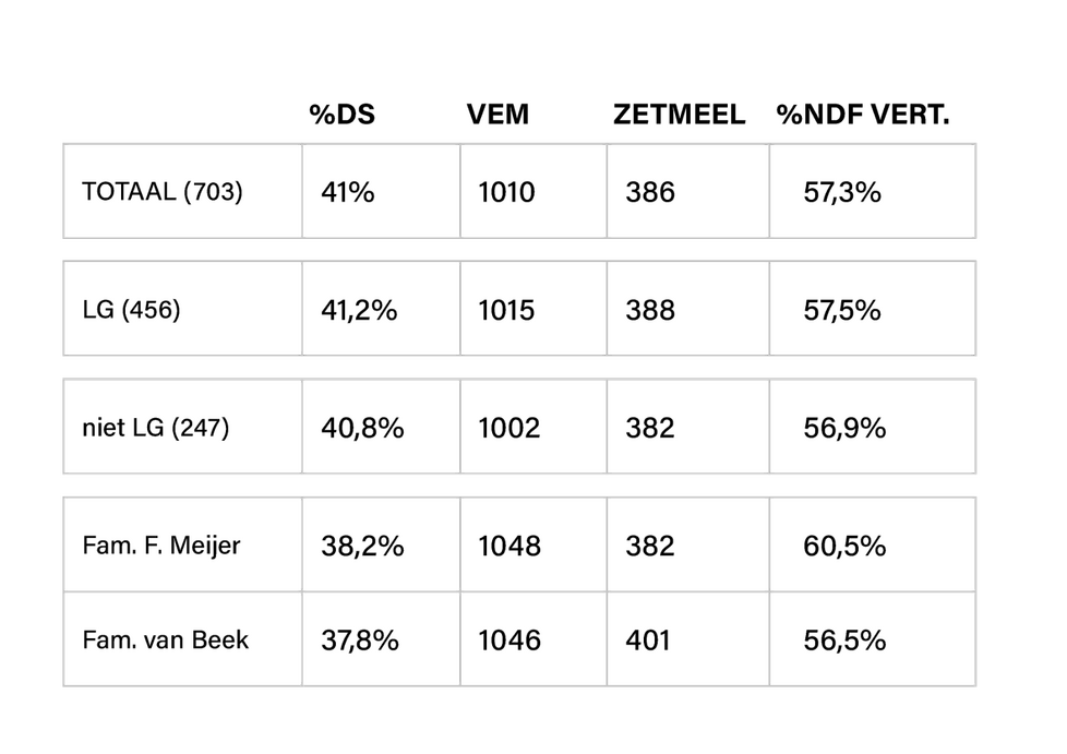 De winnaars komen dit jaar uit verschillende provincies, al zijn het opnieuw dezelfde rassen die bovenaan eindigen. In Beckum (Overijssel) behaalde melkveebedrijf Meijer met het ras LG 31.205 een indrukwekkende score van 1.048 VEM per kg droge stof bij 38,2% DS. In Vogelwaarde (Zeeland) realiseerde S. van Beek met LG 31.206 een score van 1.046 VEM per kg droge stof bij 37,8% DS.