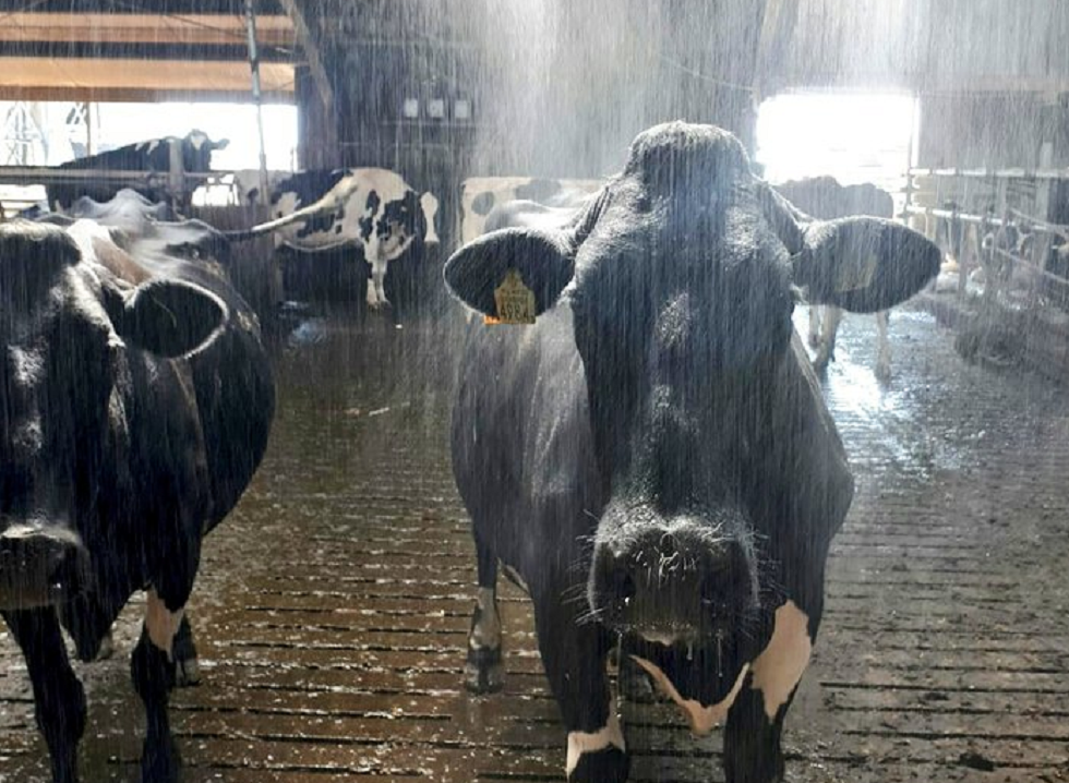 De koeien van Heleen Lansink uit St. Isidorushoeve (OV), boerin Liz, Martijn te Riet uit Buurse (OV), Wichard Kievit uit Bunne (DR) en Yvonne Oosterhuis uit Wittelte (DR) krijgen een verfrissende douche in de stal.