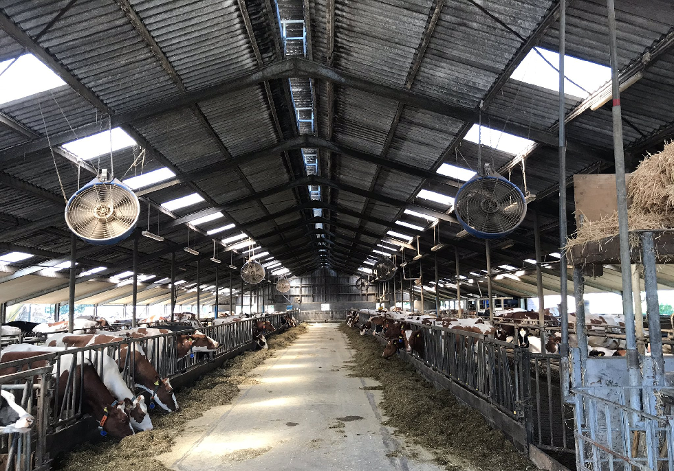 Melkveehouder Rudie Freriks uit Luttenberg (OV) heeft de ventilatoren volop draaien in de stal. en ook de koeien van Diederik Groen en Janet Mensink uit Den Ham (OV) krijgen koelte toegewaaid.