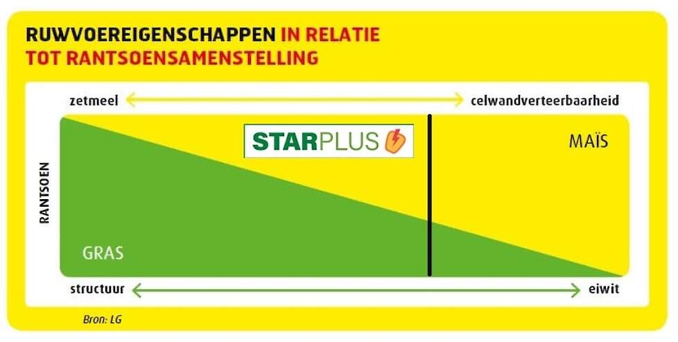 De verhouding gras – mais in het rantsoen is mede bepalend voor het maisras dat zorgt voor de beste voerresultaten. In een grasrijk rantsoen is veel pensbeschikbare energie nodig. Hier past zetmeelrijke mais goed, met een hoger aandeel onbestendig zetmeel. Deze rassen herken je bij LG aan het Starplus label >>