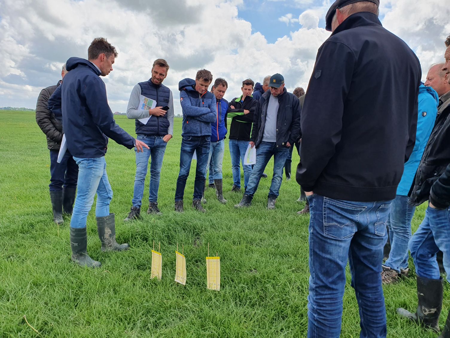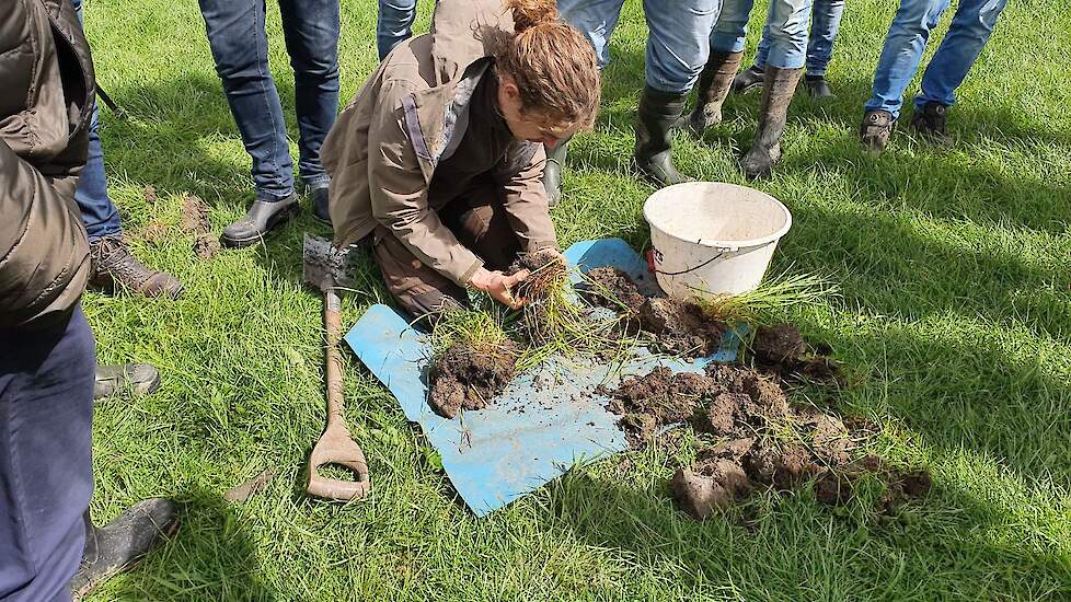 Na de introductie van Marten de Jong in de ontvangstruimte van de boerderij verplaatst de groep zich naar een van de graslandpercelen van de melkveehouder. Daar vertellen Anne Jansma (specialist natuurinclusieve landbouw) en Jeroen Onrust (wormenonderzoeker) meer over het bodemleven op en onder de graszode van De Jong.