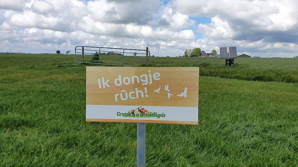 De veldbijeenkomst werd georganiseerd door Livinglab Fryslân en Grutsk op ús Greidefûgels (een initiatief van provincie Fryslân, Wetterskip Fryslân, LTO-Noord, Cumela, KBF, Nordwin, Van Hall Larenstein, BFVW en AJF). Grutsk heeft dit jaar de actie: Gaat u ook rûch dongjen? Met de actie daagt het initiatief boeren uit om ruige mest uit te rijden op hun land. Boeren die mee doen aan de uitdaging ontvangen een bordje van het collectief met daarom de tekst ‘Ik dongje rûch!’ wat vrij vertaald betekent dat de boer ruige mest uitrijdt. Marten de Jong kreeg dinsdag twee bordjes uitgereikt die hij op zijn percelen met ruige mest kan plaatsen.
