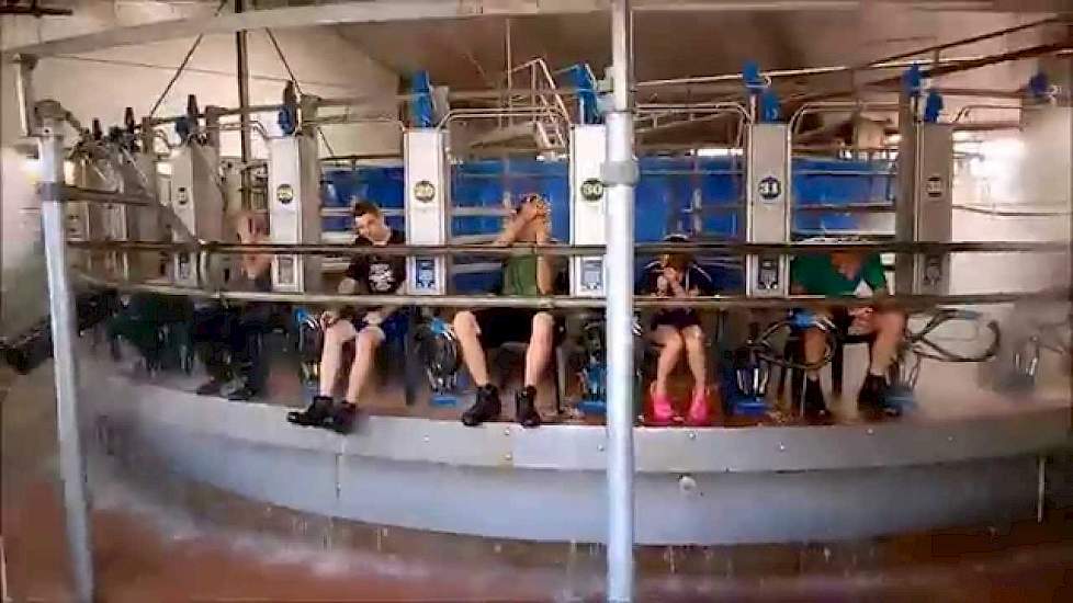 Ingrediënten: een beste sproeier, een giertank gevuld met water een een hoop jongelui zonder koudwatervrees in een grote draaimelkstal... De geluidskwaliteit van het YouTube-filmpje is niet geweldig, maar de beelden spreken voor zich. Op de Facebookpagina van Milchviebetrieb Albring is het filmpje (met muziek) ook te vinden.