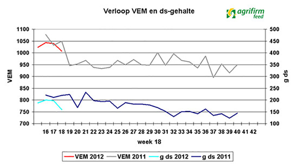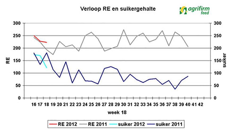 Door de goede groeiomstandigheden worden de gevormde suikers direct weer gebruikt voor het maken van bladmassa. Het suikergehalte is het gras is de afgelopen week dan ook gedaald naar ongeveer 120 g/kg ds. De kans op pensverzuring is hierdoor laag.