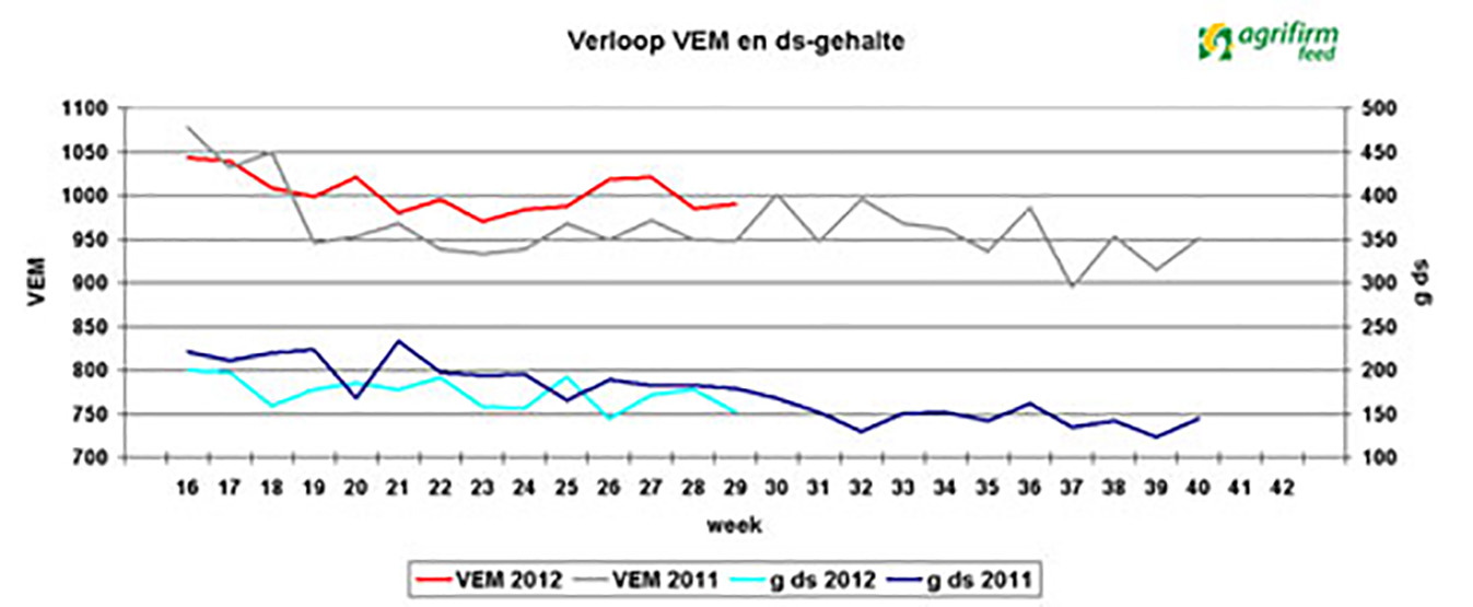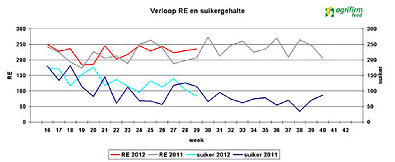 Niet de kwaliteit bepaalt momenteel de melkproductie uit gras, maar veel meer het aanbod en de omstandigheden waaronder uw koeien weiden. Afhankelijk van het aanbod is het advies om tijdig de graskuil open te trekken. Vooral de wat later geoogste eerste snede is uitermate geschikt om naast het gras te voeren. Dit bevat voldoende structuur en door het lage eiwit past deze kuil prima naast het eiwitrijkere gras.
