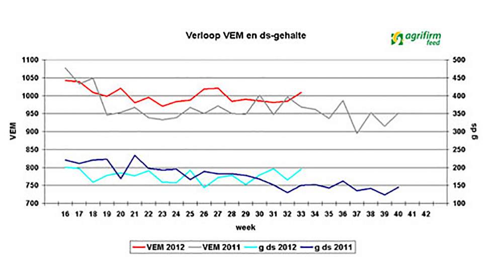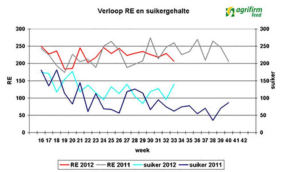 Uit de grasanalyses van afgelopen week blijkt dat de voederwaarde van weidegras momenteel vrij constant is. Ook het ruw eiwit in het gras schommelt de afgelopen weken beperkt. Afgelopen week lag het ruw eiwit gemiddeld rond 205 g/kg ds. Voor bedrijven die volledig weiden of beperkt snijmaïs bijvoeren is dit ruim voldoende. Op bedrijven waar snijmaïs een belangrijk deel van het rantsoen is zal er, afhankelijk van het ureumgehalte in de melk, voor nieuwmelkte dieren een eiwitaanvulling nodig zijn.