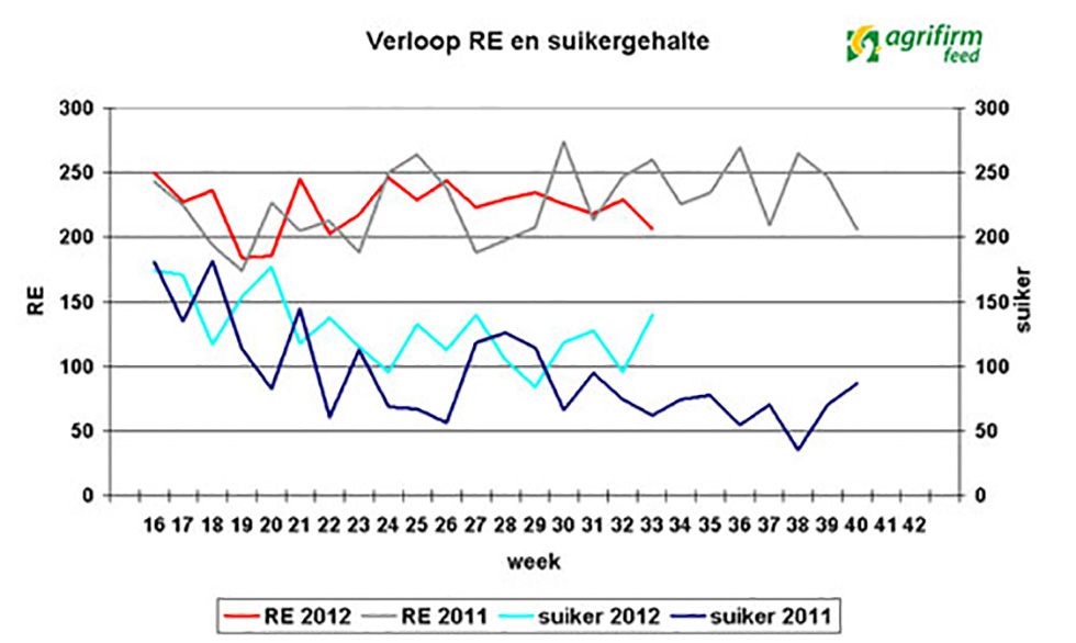 Uit de grasanalyses van afgelopen week blijkt dat de voederwaarde van weidegras momenteel vrij constant is. Ook het ruw eiwit in het gras schommelt de afgelopen weken beperkt. Afgelopen week lag het ruw eiwit gemiddeld rond 205 g/kg ds. Voor bedrijven die volledig weiden of beperkt snijmaïs bijvoeren is dit ruim voldoende. Op bedrijven waar snijmaïs een belangrijk deel van het rantsoen is zal er, afhankelijk van het ureumgehalte in de melk, voor nieuwmelkte dieren een eiwitaanvulling nodig zijn.