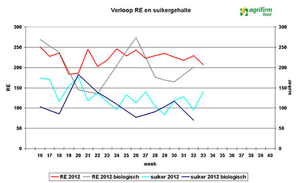 Uit de grasanalyses van afgelopen weken blijkt dat het ruw eiwit in biologisch geteeld gras toeneemt. De oorzaak is de toenemende mineralisatie als gevolg van de geleidelijk stijgende bodemtemperatuur. Ook voor de komende week worden hoge temperaturen verwacht. De mineralisatie zal dus verder toenemen. De verwachting is dan ook dat het ruw eiwit de komende tijd verder zal stijgen.