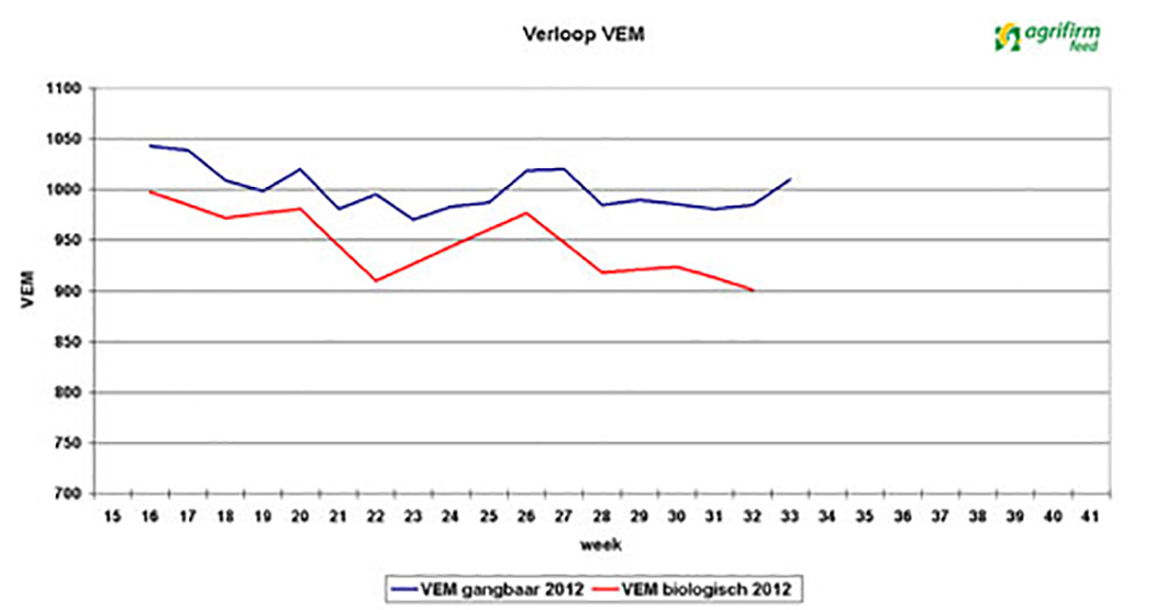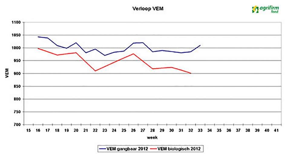 De voederwaarde van zowel biologisch als gangbaar geteeld weidegras is momenteel vrij constant. Wel ligt de voederwaarde op biologische bedrijven ruim 75 VEM lager.