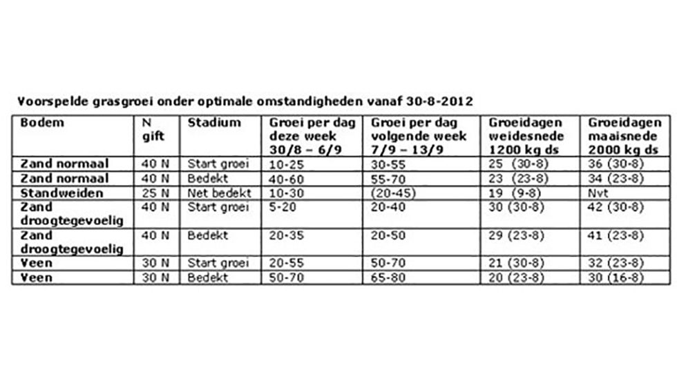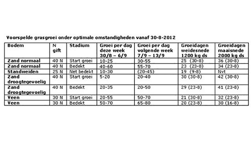 Hoewel er plaatselijk al weer veel neerslag is gevallen, zijn de verschillen groot. Een strook van Zuid West naar Noord Oost (Friesland) heeft op dit moment een neerslagoverschot. In Groningen, Overijssel (op Noord West na), grote delen van Gelderland, de Peel en bovenin Noord Holland is sprake van een neerslagtekort (over de periode vanaf 1 april tot en met 29 augustus). Dit betekent dat op sommige delen de gegevens uit de tabel onder ‘ Droog’ wel degelijk van toepassing zijn, terwijl op ander plaatsen de groei (weer) redelijk normaal verloopt.Het gaat nu om de groei van een zeer late derde, vierde of zelfs vijfde snede. In de praktijk lopen de sneden nu uit elkaar. Het is hierdoor niet meer exact mogelijk om aan te geven voor welke snede de groei bestemd is. Globaal is de groei weergegeven voor dit deel van het seizoen en het stadium van het gewas (begin groei of bedekt), waardoor het snedenummer maar een kleine invloed heeft. Wel heeft het aantal bemestingen met dierlijke mest invloed op de grasgroei, in verband met de nawerking. De groei is weergegeven bij een N-werking (exclusief stikstof uit de bodem) van 50 kg (40 voor veen). Omdat de kunstmest stikstofgift wordt afgebouwd is voor de overzichtelijkheid gekozen voor het weergeven van één globale stikstofgift. In de meeste gevallen wordt er nog nauwelijks kunstmest gestrooid en ook de laatste dierlijke mest is op dit moment gegeven. De hoeveelheid werkzame N bestaat dus voor het grootste deel uit N levering uit de bodem (met name veen) en nawerking.