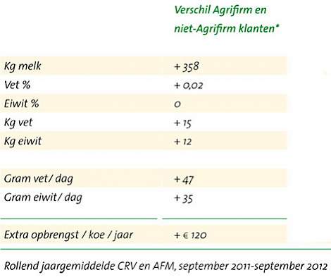 De robotmelkers van Agrifirm produceren 358 kg meer melk per koe per jaar dan niet-Agrifirm klanten. Opvallend: ook de gehalten zijn gelijk of hoger, waardoor de kilogrammen vet en eiwit beduidend hoger zijn.