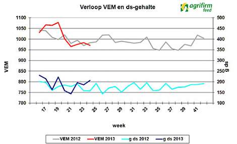 Ondanks grote verschillen in ruw eiwit en suikergehalte verschilt de VEM minder. De laagste waarde kwam uit op 930 VEM en de hoogste waarde op 997 VEM/kg droge stof.