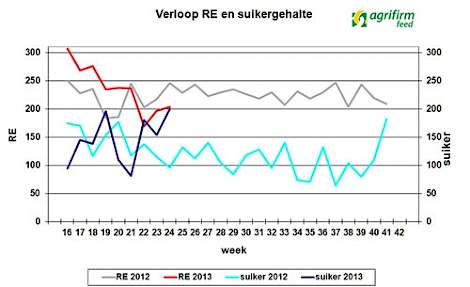 Op bedrijven waar de melkkoeien in mooi etgroen lopen is het ruw eiwitgehalte in gras ruim boven de 200 g/kg droge stof. In de percelen die al eerder geweid zijn, of te weinig bemest na de vorige snede, is het ruw eiwitgehalte uitzonderlijk laag; slechts 130 gram ruw eiwit! Op deze laatste percelen gaat dit, wanneer u dit niet aanvult met bijvoeding, ten koste van de melkeiwitproductie. Ook het ureumgehalte in de melk is dan laag.