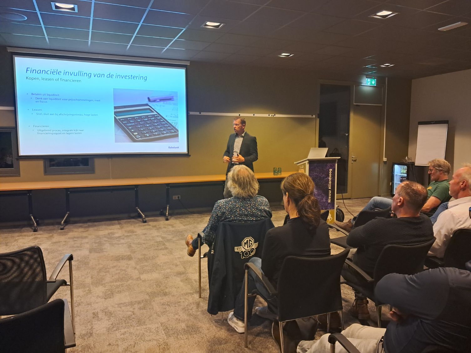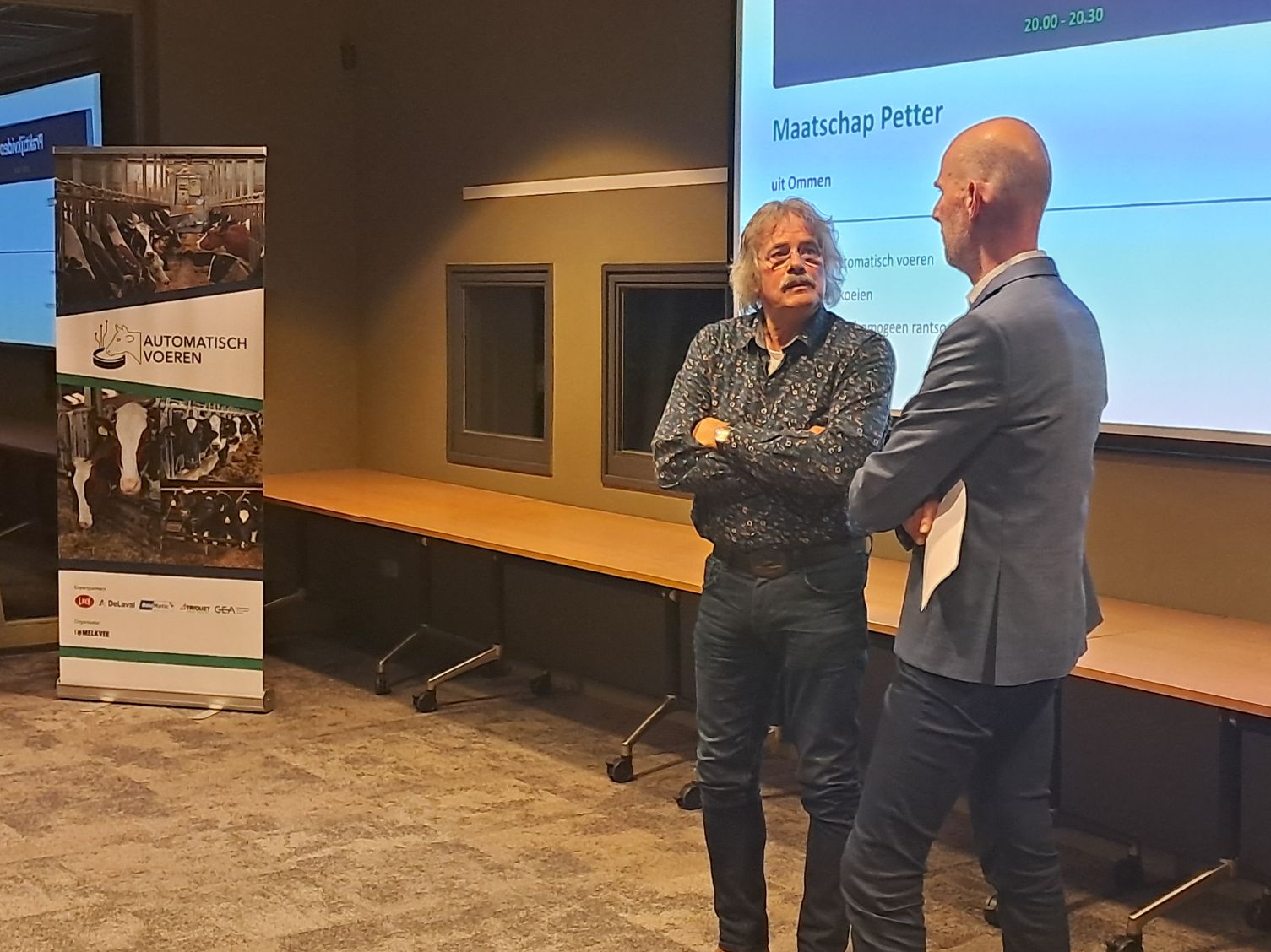 Rick Hoksbergen (Countus) en Marijn Dekkers (Rabobank) belichten de financiële kant van automatisch voeren. Beeld: Karin van den Barg