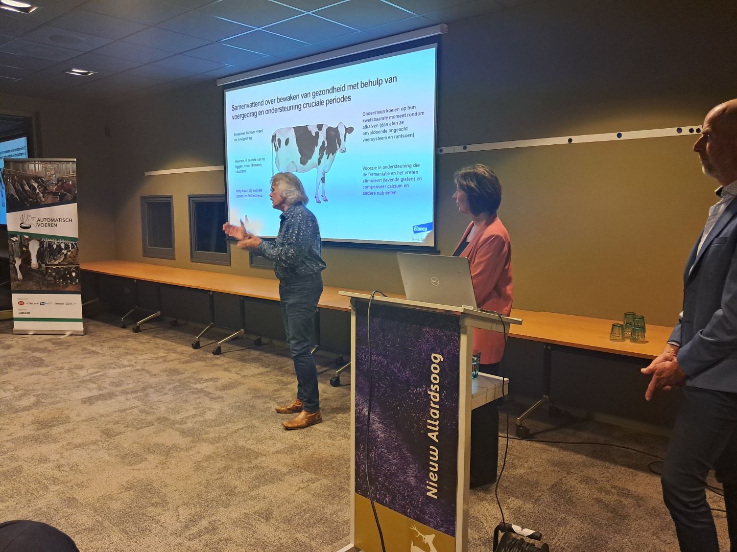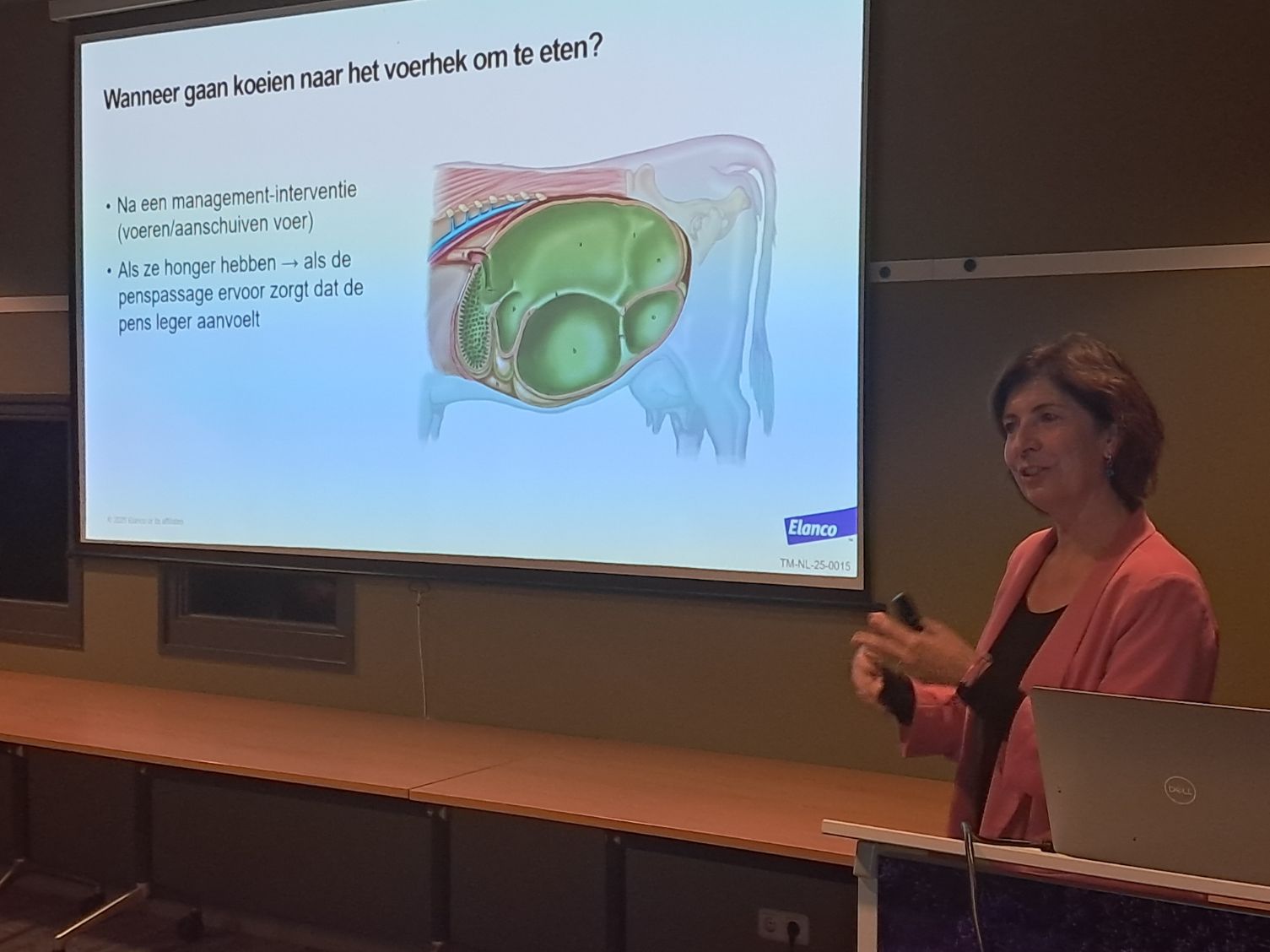 Angelique Rijpert-Duvivier (Elanco) gaat in op de effecten van automatisch voeren op diergezondheid en natuurlijk vreetgedrag. Beeld: Karin van den Barg