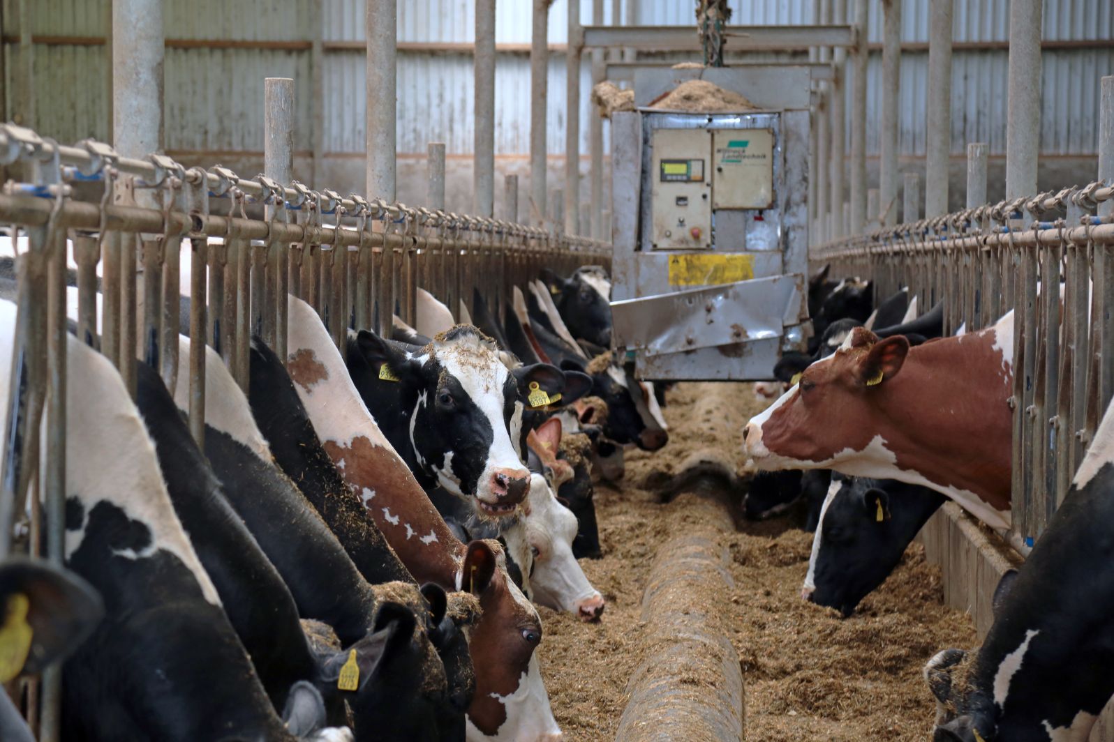 Je ziet het automatische voersysteem aan het werk in de stal: voeren, mengen en verdelen over de voergang. -